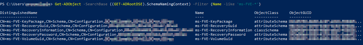 Get-ADObject -SearchBase ((GET-ADRootDSE).SchemaNamingContext) -Filter {Name -like 'ms-FVE-*'}