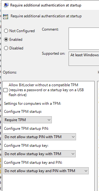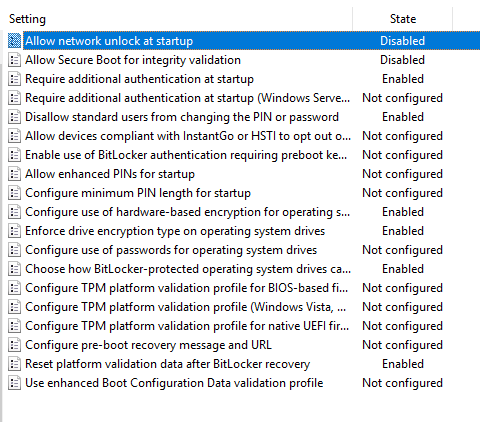 - Allow Network Unlock at Startup: Technically you can set up a Bitlocker Drive Encryption Network unlock server and allow workstations to unlock themselves over the LAN. We do not use this.