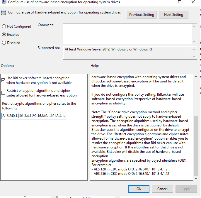 - Configure use of hardware-based encryption for operating system drives: This we will set to use the encryption mechanisms built-in to the drive if present (which will save on resources) but fallback to software if needed. We don't restrict algorithms as most of our machines are newer and this is unlikely to cause issues, but you can specify if it makes sense for your threat model. See image below: