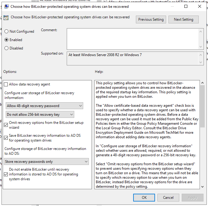 - Choose how Bitlocker-protected operating system drives can be recovered: This is where the magic happens. See the image below. We uncheck Allow Data Recovery Agent as we do not use them (More info on DRAs here). We Allow 48-Digit recovery password, and do not allow 256-bit recovery key. We really only want users (or techs) to punch in a password if things go sideways. We check Omit Recovery Options... as we don't want end users fiddling with anything. We check the Save Bitlocker Recovery Information to AD DS box, which does exactly what it says on the tin. For Configure Storage we set this to Store recovery passwords only, again somewhat self-explanatory. We also check the Do not enable bitlocker until revoer information is stored in AD DS box so that we don't end up with an encrypted device with no recovery key.