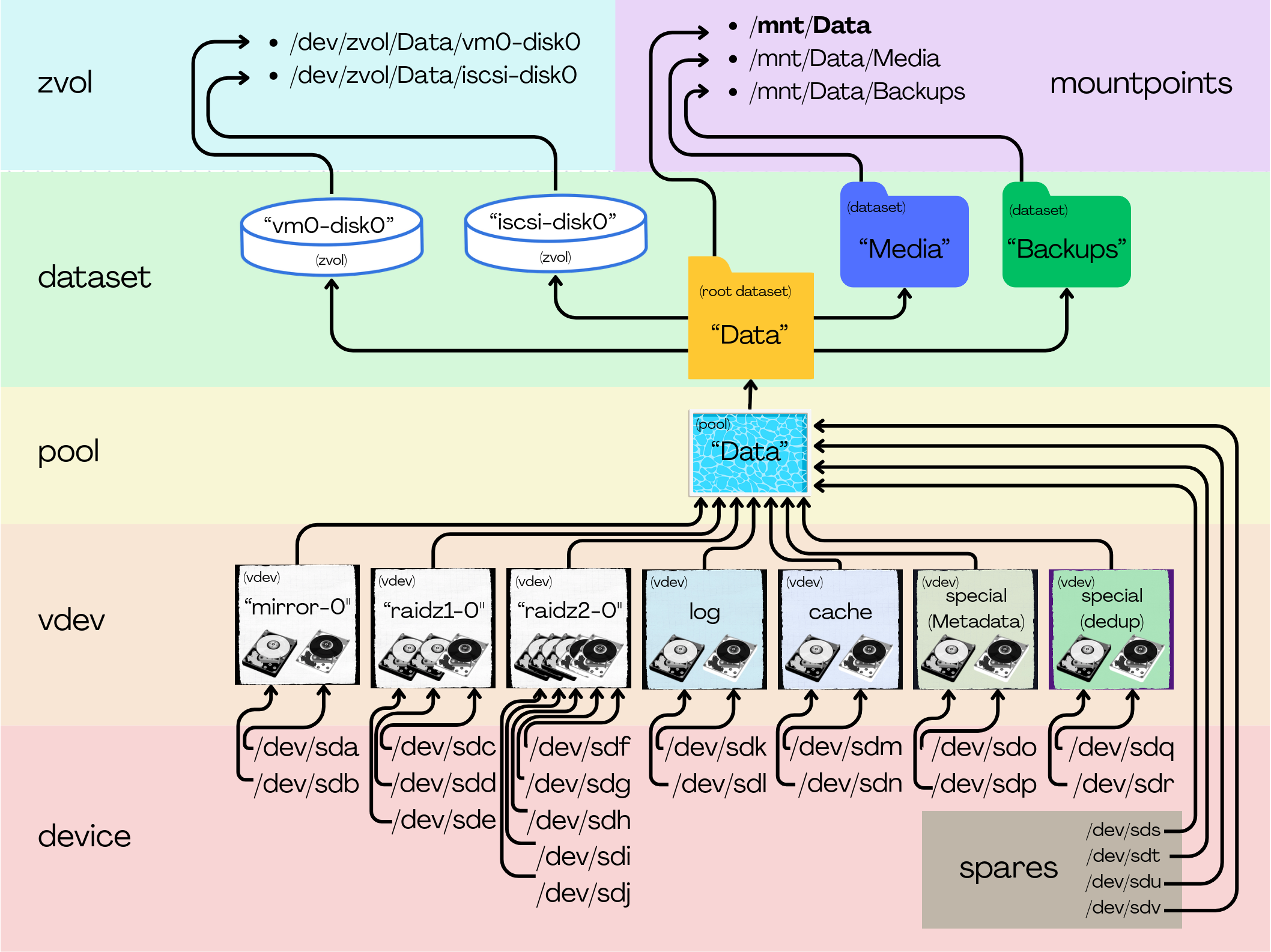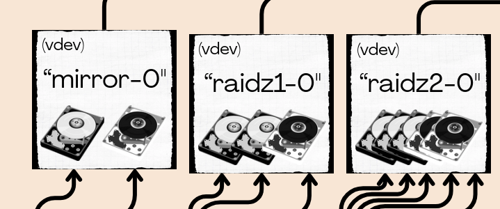 - vdev - A virtual device made up of actual disks. For example, two disks can be mirrored (RAID1) in a single vdev, or three disks in a RAIDZ1(RAID5)