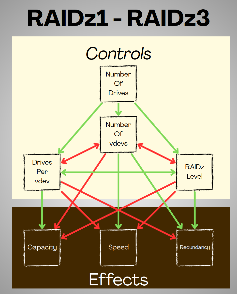 - If we increase the RAIDz level, our minimum vdev width goes up, and we can create fewer vdevs.