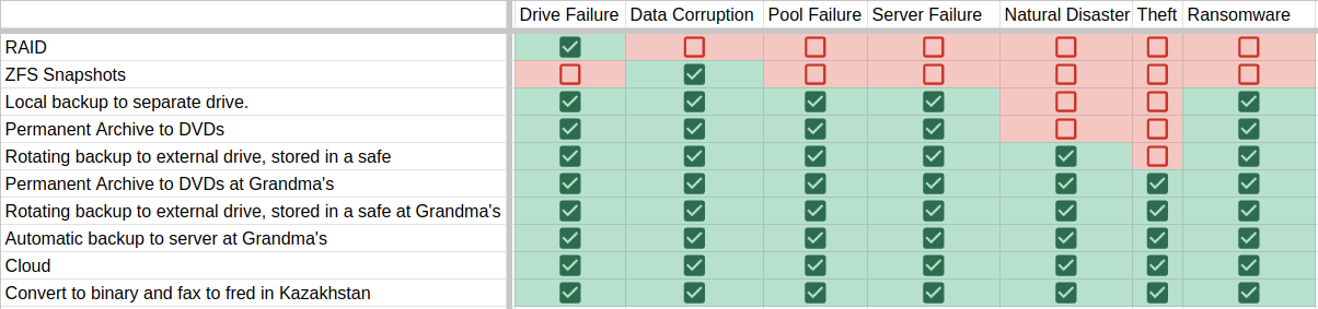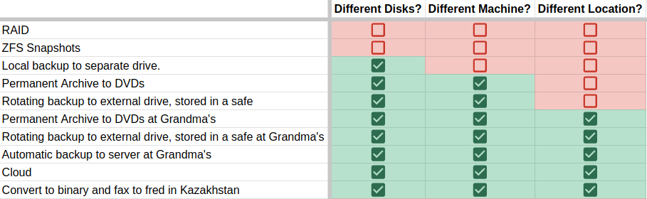 These three questions will tell you, more or less, to which of the threats your backups are resistant. That doesn't mean that every solution that checks these boxes will be a good one however: