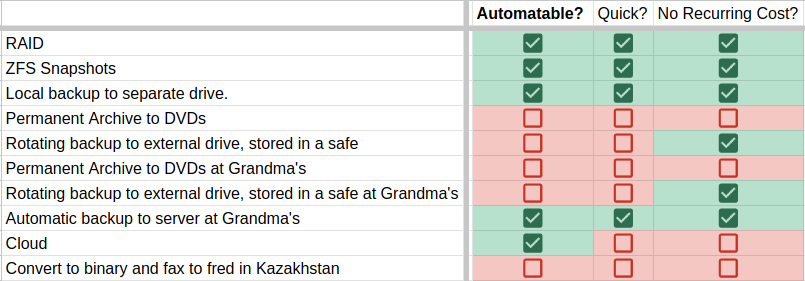 Even for the options that have no recurring cost, you'll need to make some kind of initial investment. RAID assumes you have the extra storage for parity, as do ZFS snapshots. You'll need an external drive to toss in a safe, or a whole other computer with drives and a way to connect them (like an enclosure) if you want a server at grandma's. This is hard to quantify as you likely have some crap lying around you can use. Even at work, I've repurposed old servers and drives for backups many, many times.