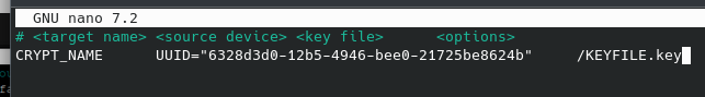 Now we need to set things up to mount automatically on boot. That means first editing /etc/crypttab and adding an entry that looks something like this: