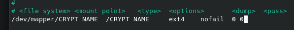 Column one is the location of our decrypted device (after /etc/crypttab happens), the second is the folder where we want it mounted, the third is the filetype, fourth is options (I recommend using nofail, as without it, if the encrypted disk can't be mounted the system will fail to boot.)