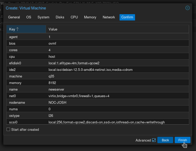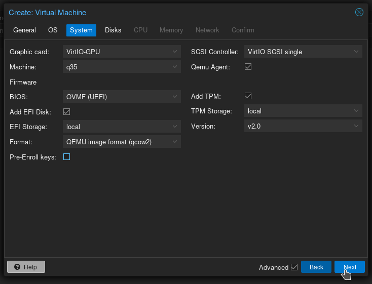 Check the box for Qemu Agent. Having the QEMU agent on our VM gives us a bunch of cool features within Proxmox.