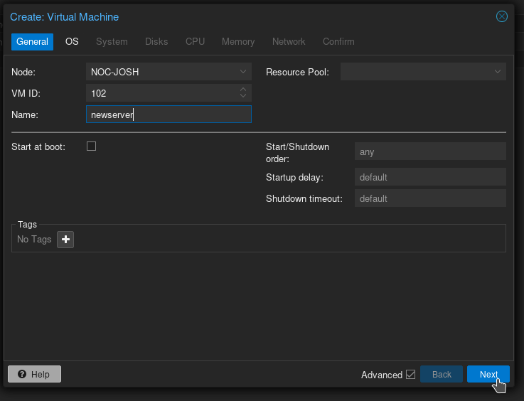 Let's check the box near the bottom right marked Advanced, Enter a Name, and click Next. I like to make sure the name matches the future hostname of our VM, but they're easy to rename later on.