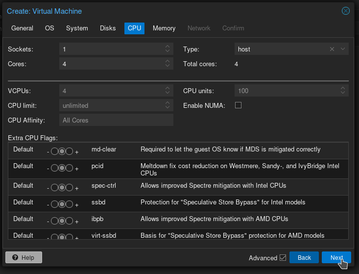 For Cores, set this acording to your workload. 4 Cores total is a good starting point. Remember, this cannot be higher than the total number of cores your Proxmox server has.