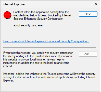 So that didn't work. After a bit of research, a few options presented themselves. One was to disable Internet Explorer's Enhanced Security Configuration, which is probably a bad idea for a variety of reasons.