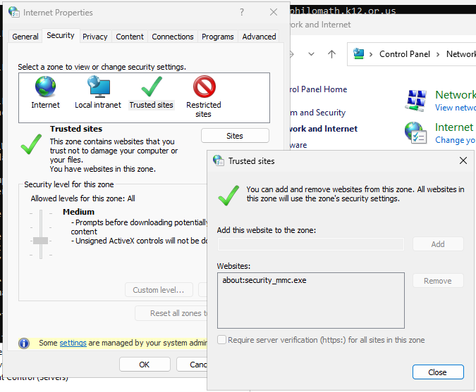 Now if we go to Control Panel > Network and Internet > Internet Options > Security > Trusted Sites > Sites
