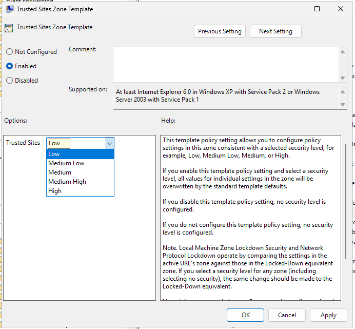 Weirdly enough, within the GPO settings pane this appears as High instead of Low...