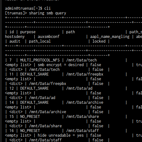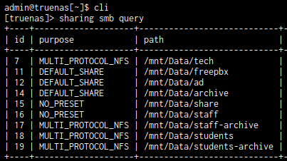 Run the command sharing smb query to get a list of your SMB shares. If you happen to have an absurdly large browser window you might get a readable table: