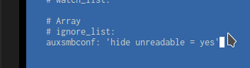 This will open a nano-like editor in the terminal. Scroll all the way to the bottom, hit tab to indent (so the line is within the sharingsmb_update: section) and add a line that says: