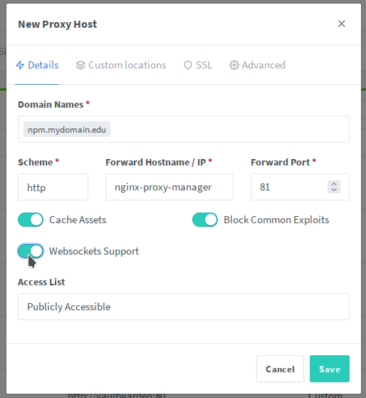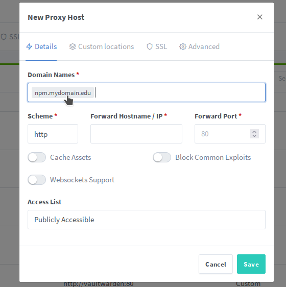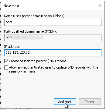 Now, and this step is important, you need to pop in to your DNS server and add an entry pointing npm.yourdomain.edu to the correct IP.