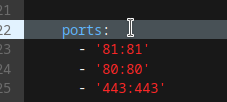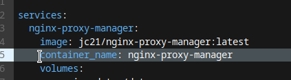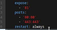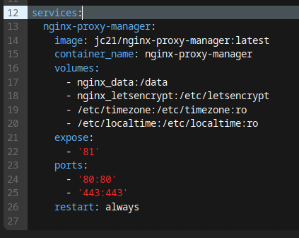 What we want to do, is have all our containers expose the ports to their web UI internally, but not externally. Next, we map the ports (using the ports option) for http(80, so we can redirect automatically) and https(443) to the nginx Proxy Manager container, so that outside machines can see it.